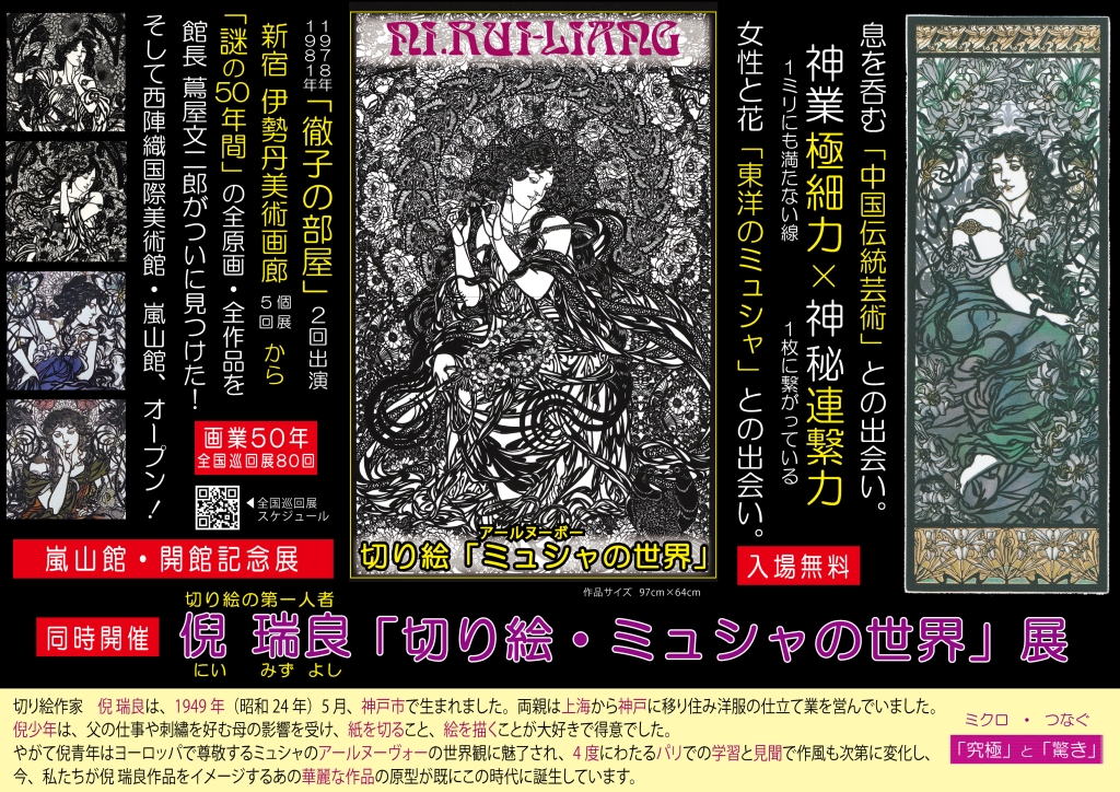 また、50年の時を経て静かなブームを全国展で巻き起こしている、息を呑む神業極細力を持つ切り絵の第一人者、倪 瑞良(にい みずよし)の「切り絵・ミュシャの世界展」も同時開催しております。